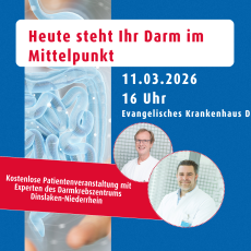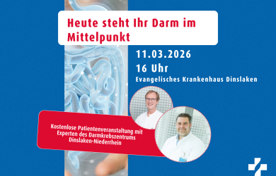 Veranstaltung: Über kaum ein Organ wird so wenig gesprochen, dabei kann es Leben retten, sich mit ihm zu beschäftigen: der Darm. In Deutschland erkranken pro Jahr 55.000 Menschen an Darmkrebs. Viele dieser Erkrankungen können durch rechtzeitige Vorsorge verhindert oder frühzeitig erkannt werden. Im Rahmen des bundesweiten Darmkrebsmonats März lädt das Evangelische Krankenhaus Dinslaken am Mittwoch, 11. März 2026, um 16 Uhr zu einer Patienteninfoveranstaltung ein. Unter dem Titel „Heute steht Ihr Darm im Mittelpunkt“ informieren zwei Chefärzte verständlich und praxisnah Vorsorge, Früherkennung und moderne Therapiekonzepte.