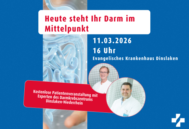 Veranstaltung: Über kaum ein Organ wird so wenig gesprochen, dabei kann es Leben retten, sich mit ihm zu beschäftigen: der Darm. In Deutschland erkranken pro Jahr 55.000 Menschen an Darmkrebs. Viele dieser Erkrankungen können durch rechtzeitige Vorsorge verhindert oder frühzeitig erkannt werden. Im Rahmen des bundesweiten Darmkrebsmonats März lädt das Evangelische Krankenhaus Dinslaken am Mittwoch, 11. März 2026, um 16 Uhr zu einer Patienteninfoveranstaltung ein. Unter dem Titel „Heute steht Ihr Darm im Mittelpunkt“ informieren zwei Chefärzte verständlich und praxisnah Vorsorge, Früherkennung und moderne Therapiekonzepte.